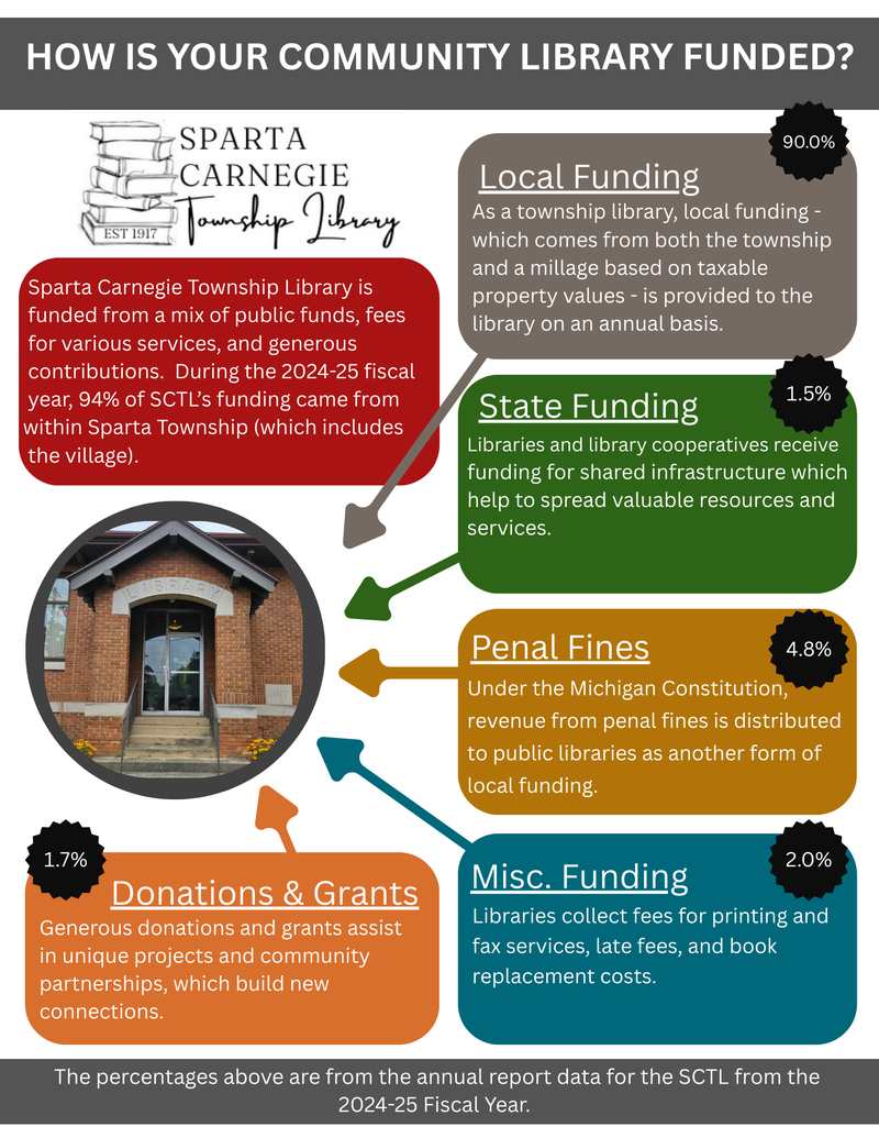 The library was established in 1915 when the Sparta Council Board agreed to accept a $10,000 donation from the Carnegie Corporation. Construction began on August 11, 1917, in November it was named The Carnegie Library, Sparta Michigan, and was dedicated in December. Since that time, the library in Sparta has provided the community with services to meet their needs. The staff of Sparta Carnegie Township Library strives to provide friendly home town service in person and through our website. On our website you can access your account, find out what’s new at the library, get answers to reference questions, explore links to authoritative sites, search for information by using MeL Databases, download audio and e-books through Libby and Hoopla. Thank you to all of our patrons and our community for your support. Please contact the library to let us know how we can support you.